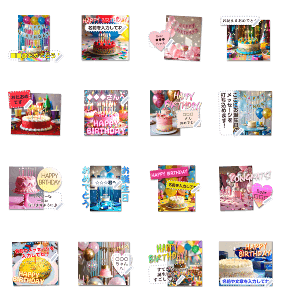空欄に名前や文など自由に書き込める♥誕生日ケーキや派手可愛いバースデーパーティー会場の写真風のポップ&キュート&華やかなお祝いメッセージスタンプです♪ 現在この商品は一部のスマートフォン版LINE 10.3.0以上のトークルームでのみ使用できます。動作環境の最新情報はヘルプをご確認ください。