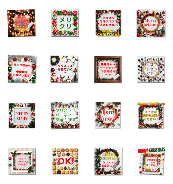 文章を書き込めるので名前や固有名詞などいろんなトークができちゃう♪実写風のオーナメントや柊・サンタ・クッキー等♥華やかなクリスマスカード型メッセージスタンプ♪ 現在この商品は一部のスマートフォン版LINE 10.3.0以上のトークルームでのみ使用できます。動作環境の最新情報はヘルプをご確認ください。