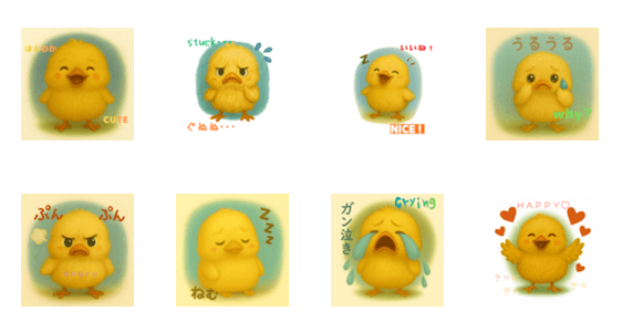 Adorable fluffy chicks drawn in soft pastel style! Each shows a cute emotion laugh, cry, love, or sleep.