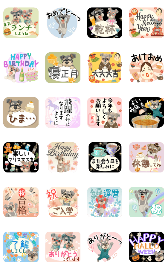 スマホ画面いっぱいに豪華に広がるスタンプでお正月のご挨拶!シュナ/シュナウザー/動く/飛び出す/年賀状/あけおめ/年末年始/誕生日/お祝い/合格/入学/桜/還暦/敬語/メガネ