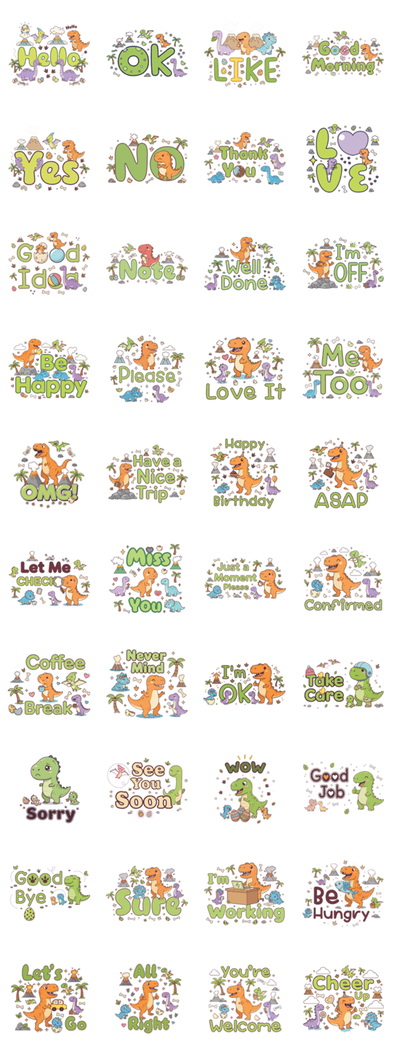 可愛い恐竜の日常英会話! 「Hello, OK, OMG, Thank You, Love It」で気持ちを表現。友達や家族とのトークに最適です。SEOタグ: 恐竜, かわいい, 日常, 英会話。