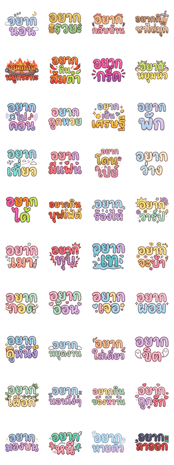 | スタンプ説明 | (I want to...) such as I want to sleep. to be rich. go home. drink bubble tea. eat Moo Krata (Thai BBQ). pull someone's hair. disappear. and so on |