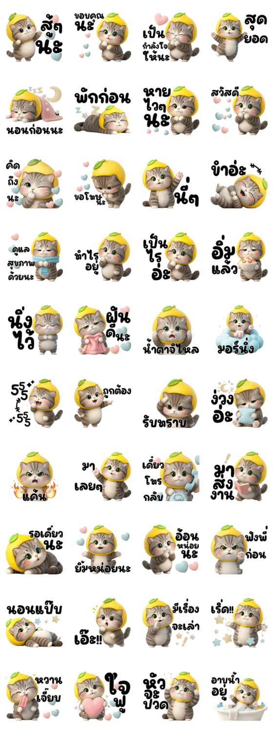Mameow, the cutest cat in a lemon peel hat, is here to cheer you up! Great for all moods: good luck, thank you, miss you, relax, and all popular phrases.