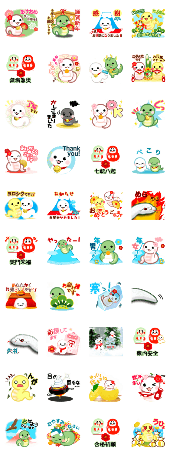 新年明けましておめでとうございます。金メダルをかけた、かわいい巳(蛇)です。緑、白、黒 ダルマ、リアルの個性豊かなスタンプで素敵な年をお過ごしください。