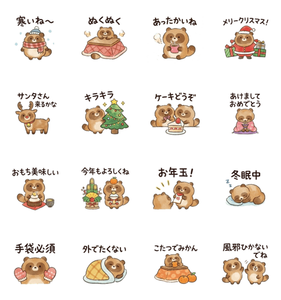 寒さに負けず冬を楽しむたぬきたちのスタンプです♪