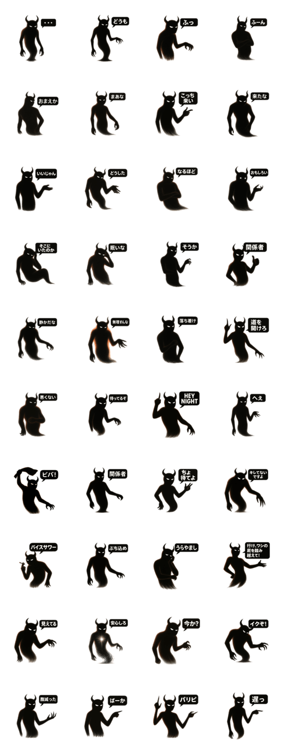 夜にふっと現れる黒い影のスタンプ。 無言・一言・淡々としたリアクションで あなたの気持ちを静かに伝えます。