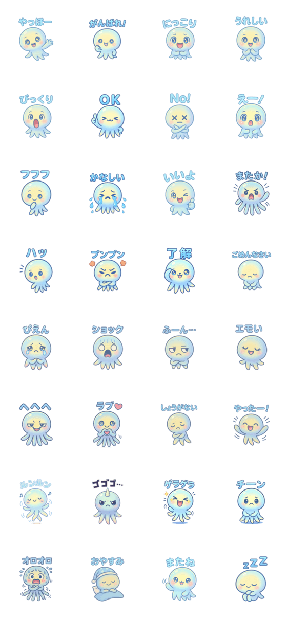 ふんわりクラゲ「キラマルちゃん」のスタンプ。喜び、怒り、へこみ、応援など毎日使える表情がいっぱい。かわいく気持ちを伝えたい時にぴったりの癒し系スタンプです。