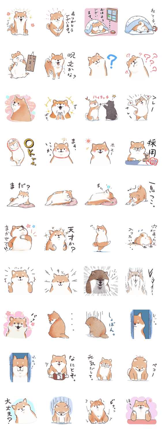 リラックスしたカジュアルな会話に使える、のんびりマイペースな柴犬のスタンプセットです。かしこまりすぎたくないときにぴったりです。