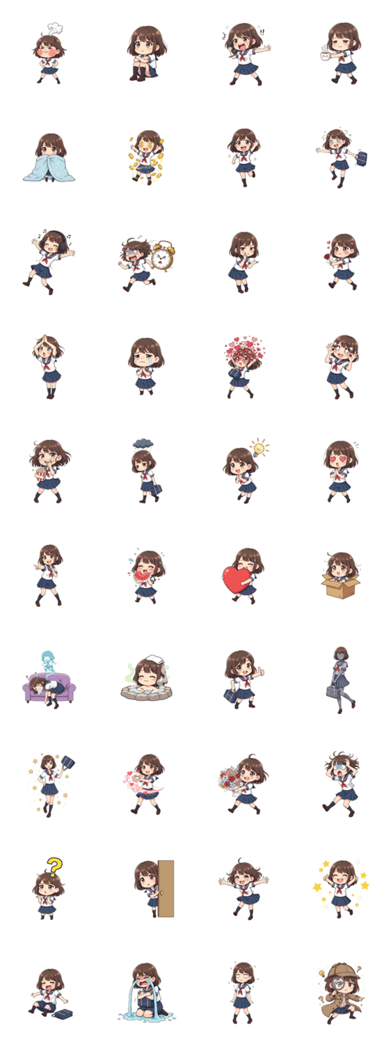 | スタンプ説明 | セーラー服女子の感情豊かなスタンプ集。ハート、OK、怒り、食事など、毎日使える可愛いポーズが満載です! |