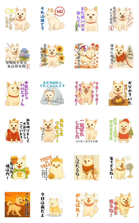 白柴の小梅ちゃんが季節のいろんな気持ちをお届け! 暑い日も寒い日も、雨の日も夕焼けの日も、かわいい仕草で想いを伝えてくれる癒しスタンプ。