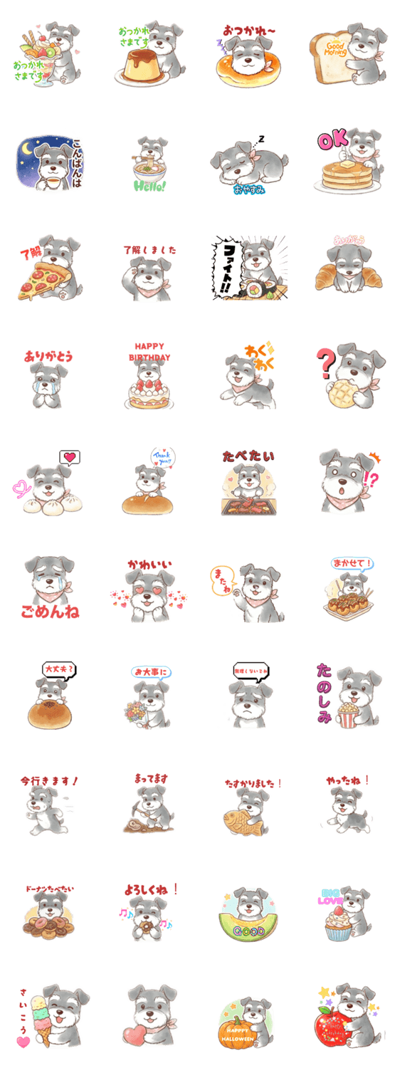 スタンプ説明 シュナウザーと食べ物のスタンプです。
