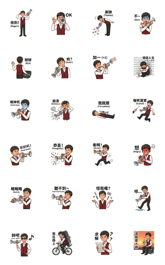 | スタンプ説明 | Lip pain, missed high notes, and the conductor's glare. Essential stickers for band geeks. Express the struggles that only trumpet players understand! |