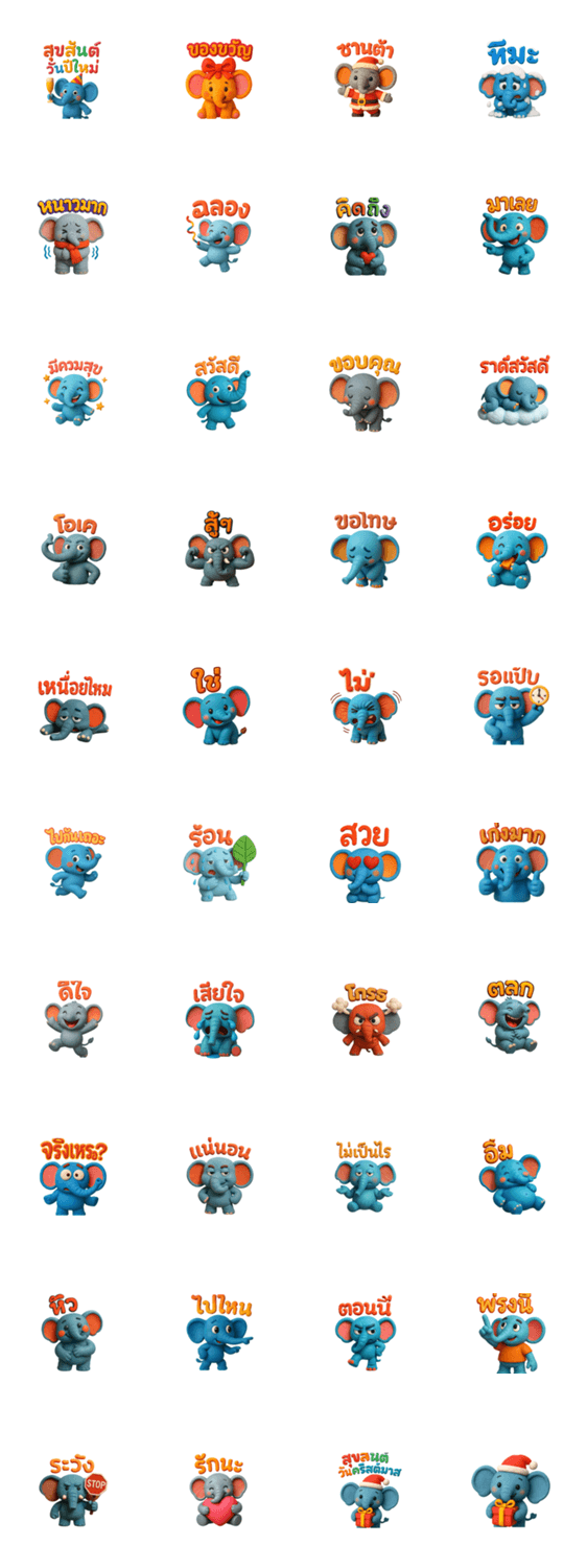 A set of 40 cute 3D elephant LINE stamps with Thai phrases, perfect for Christmas greetings and daily chats. Fun, warm, and easy to use!