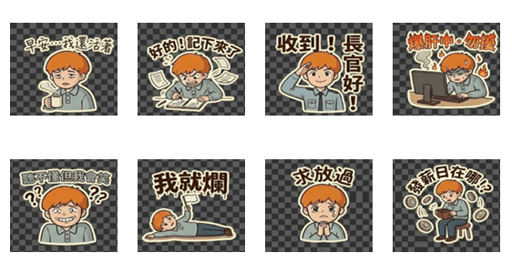 毎日の疲れ、燃え尽き、仕事の絶望感をブラックユーモアで表現したスタンプ。やる気ゼロの日や、もう無理…という気持ちにぴったりです