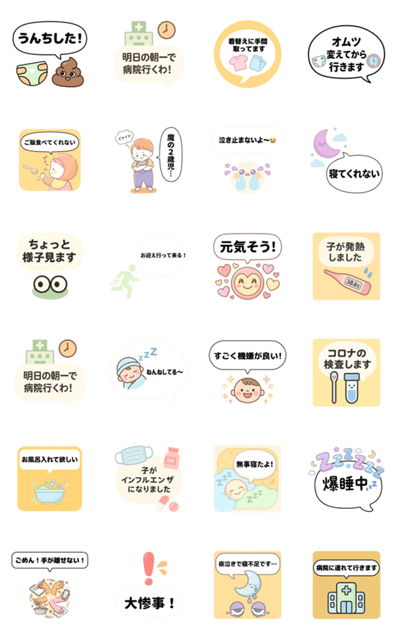 子育て中の毎日タスクに使えるシンプルなスタンプ大集合!」 『今からお迎え!』『熱出た』など、緊急連絡にも便利なスタンプ多数収録!