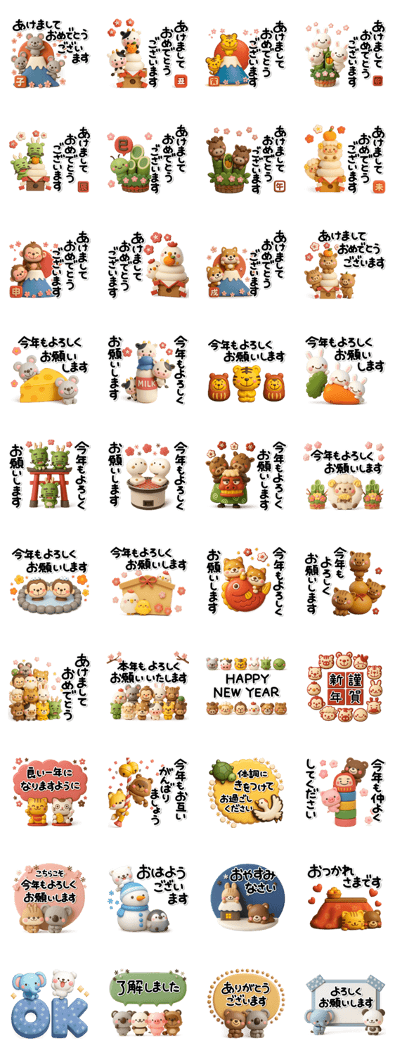| スタンプ説明 | 12年分/全種揃えました。子-ねずみ・丑-うし・寅-とら・卯-うさぎ・辰-たつ・巳-へび・午-うま・未-ひつじ・申-さる・酉-とり・戌-いぬ・猪-いのしし【作:いしいともこ】 |