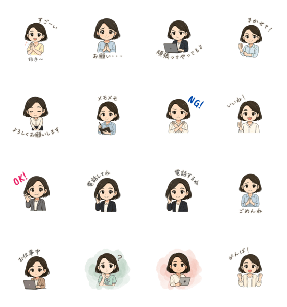 | スタンプ説明 | 職場の同僚や友だちに気軽に送れる、やわらかい雰囲気のお仕事スタンプです。毎日のちょっとしたやり取りに使いやすい表現を選りすぐって16個そろえました。 |