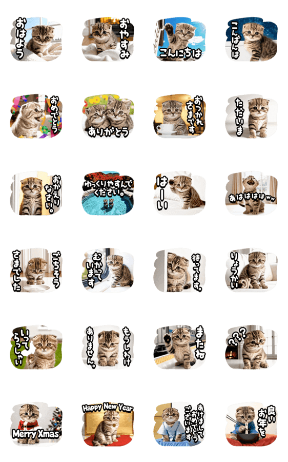 スコティッシュフォールドの子猫の実写風アニメーションスタンプです。日常・挨拶・敬語・便利・気づかい・ネコ・年末年始