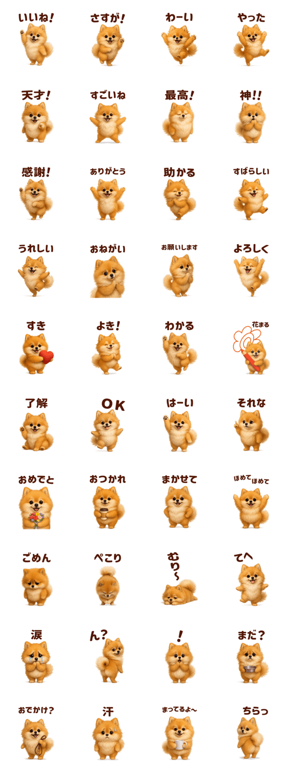 ポメラニアンがほめほめ大好きメッセージを伝えます。犬/デカ文字/友達/家族/親しい人/シニア/老眼/ママ友/同僚/同期。いいね/さすが/天才/最高/神/助かる/やった/わかる ※このスタンプはトークルームで大きく表示されるBIGスタンプです。