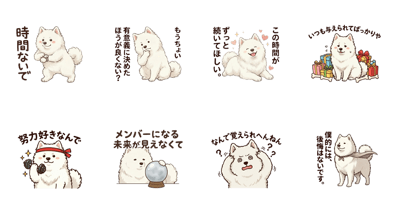 ふわふわで真っ白なサモエド犬のスタンプです。 優しい手描き風イラストで、日常の様々なワンシーンを描きました