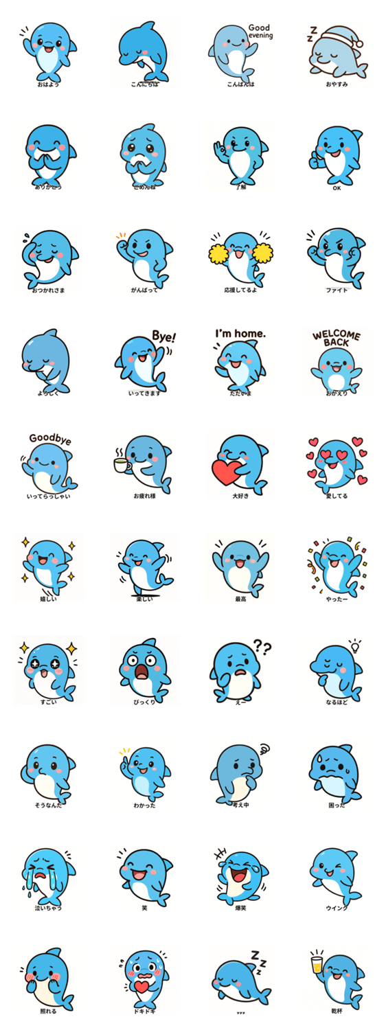爽やかなブルーのイルカが、あなたのトークに癒やしをお届けします。日常の挨拶や返事、「がんばって」「おつかれさま」といった労いの言葉まで、40種類のスタンプで網羅。