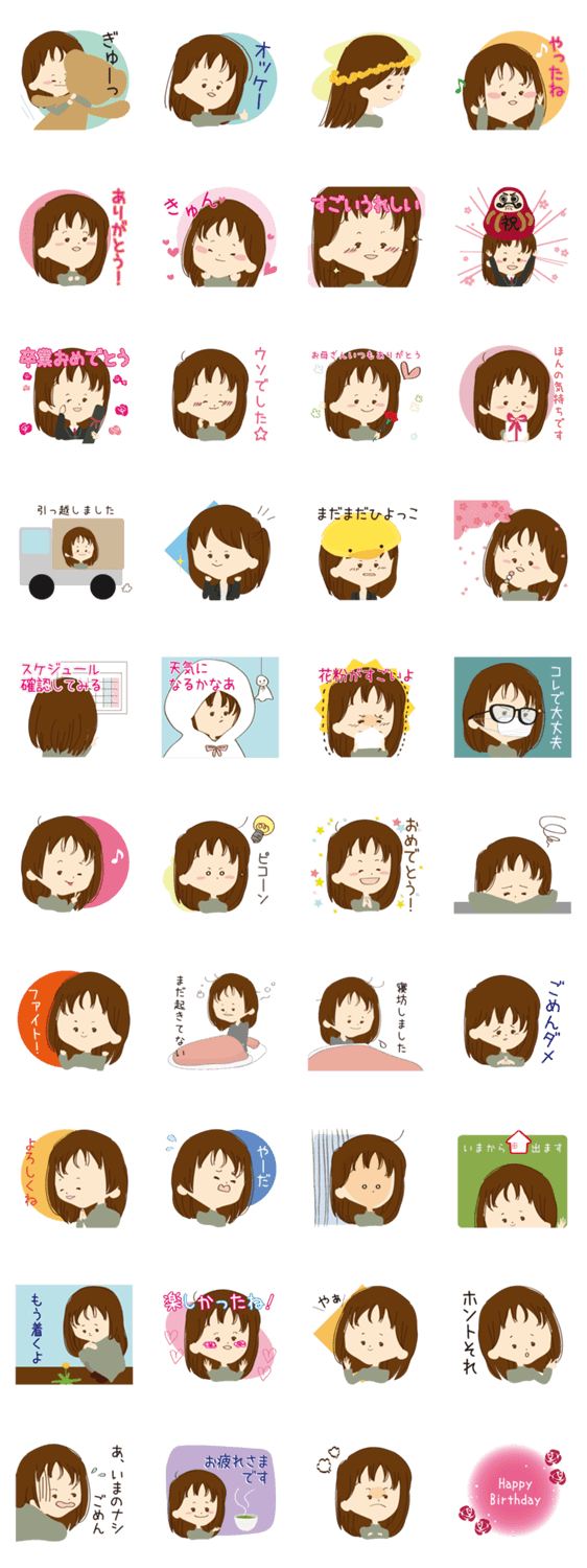 つぶらな瞳のふつうの女の子。普段の会話で使いやすいスタンプ。春にイベントにちなんだスタンプ(卒業、花粉症、引っ越し、花見、母の日、梅雨など)を揃えました。