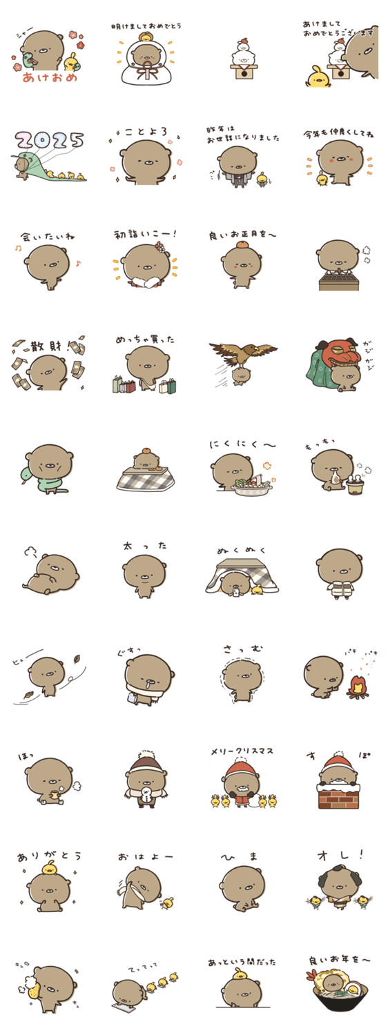 ゆるくて可愛い「くまのぽんこつ」の年末年始スタンプ。あけおめや年末の挨拶、冬のゆるい日常まで、友達にも使いやすいセットです。※2025年版スタンプの再リリースです。
