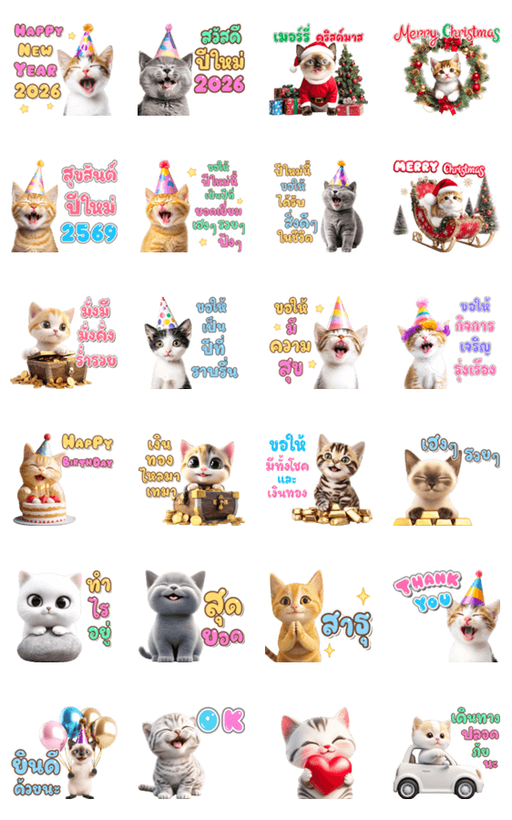 | スタンプ説明 | Happy New Year 2026 2569 Horse greetings Merry Christmas Holidays, Happy Birthday, congratulations cute, Orange white Siamese cats pastel Pop Up Big Animation |