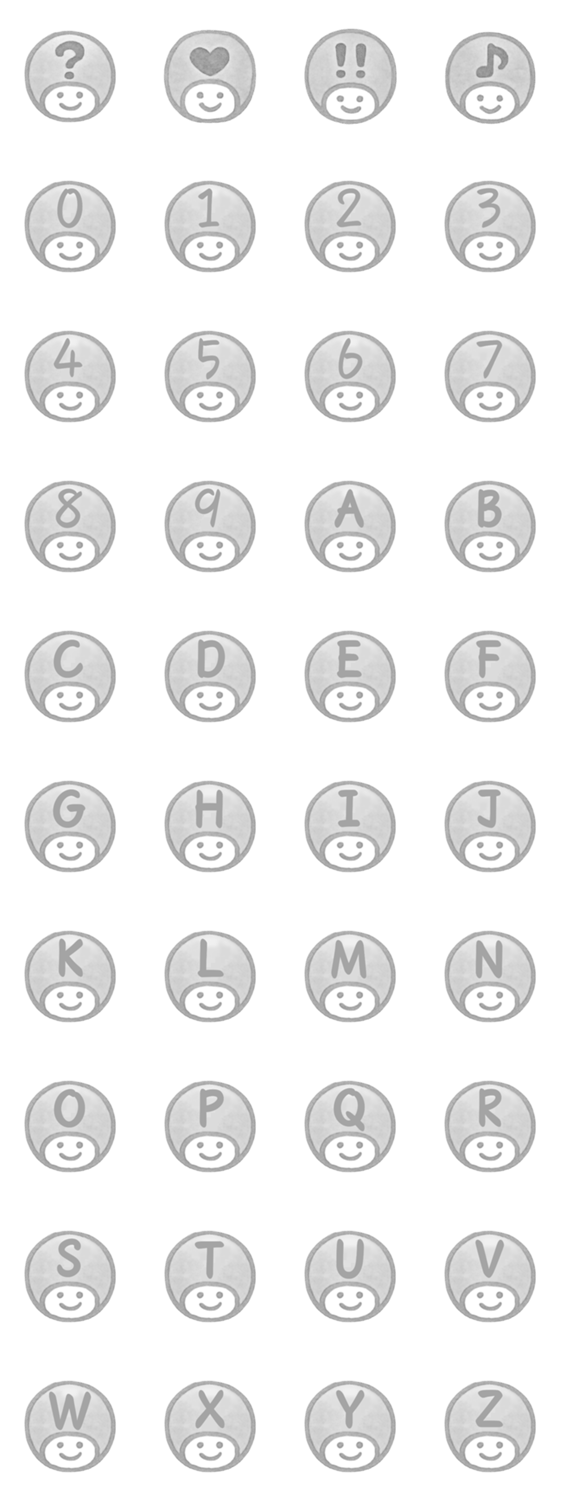 0~9の数字とA~Zのアルファベットと少しの記号。可愛い表情のイラストつきの印鑑です。かわいい白色・黒色・灰色のハンコ・判子・水彩画風・使いやすい・ぷりちー