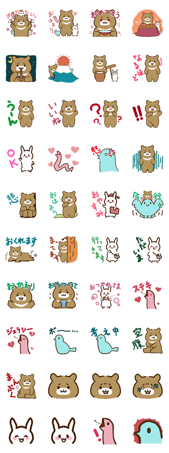 弱気なくまと森の仲間のへび・うさぎ・小鳥のかわいくてちょっとシュールなスタンプです。