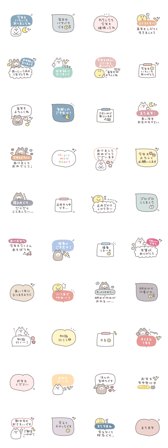 このスタンプは2025年の再販です。年末年始に1つあると便利なスタンプです。シンプル/かわいい/大人可愛い/くすみ/吹き出し/スマイル/くま/敬語/うさぎ/カラフル/年末年始