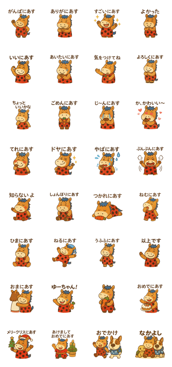 わんぱくな馬の男の子「うーちゃん」だよ! 「〜にあす」で気持ちを伝える、やさしくてちょっぴりお茶目なスタンプ。 日常のトークをほっと癒してくれるかも。