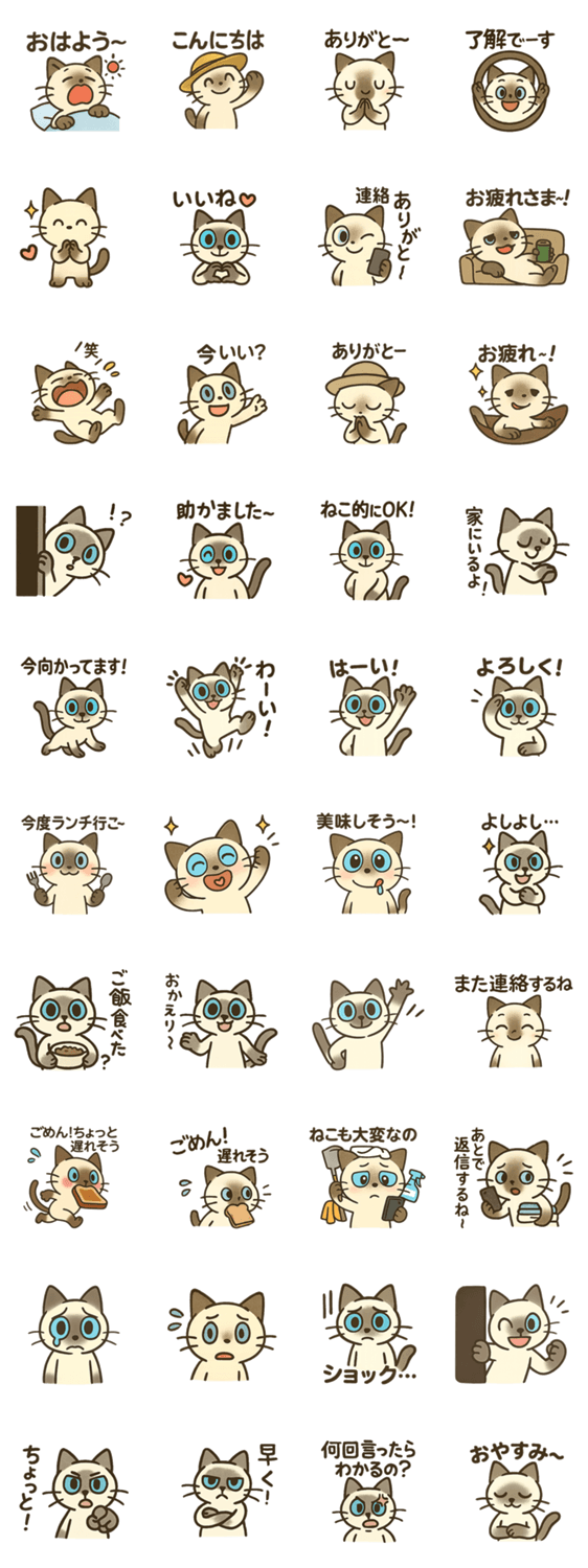 | スタンプ説明 | シャム猫が毎日使えるひとことをお届け♪お休み,親子連絡,保護者,ママ友,パパとの連絡,子供会にも便利!学校,通学,習い事の送迎,猫好き,育児中,家族との連絡,役員,大文字 |