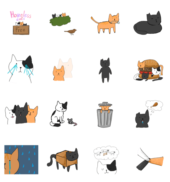 | スタンプ説明 | Stickers of three badly drawn stray cats |