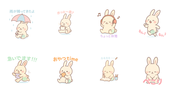 | スタンプ説明 | Cute bunny stickers that add a gentle, warm touch to your chats. Perfect for daily moods like relaxing, hurrying, or enjoying a snack. |
