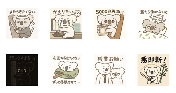 働きたくない…帰りたい…社畜の心の叫びをコアラが代弁!ゆるくて可愛い癒し系スタンプ。