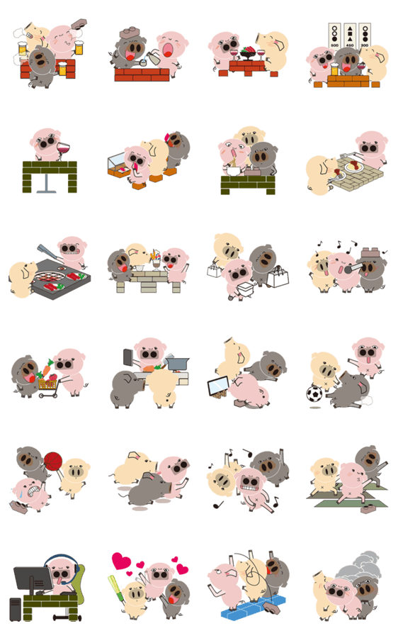 RENBLOCKキャラクター・3匹のぶたの文字なしスタンプ「娯楽篇」。日常会話のなかでのあなたの感情や状況を伝えます。