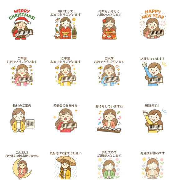 | スタンプ説明 | ピアノの先生が毎日使える、かわいいパステルスタンプ。レッスン連絡・保護者対応・モチベUPに便利です♪ |