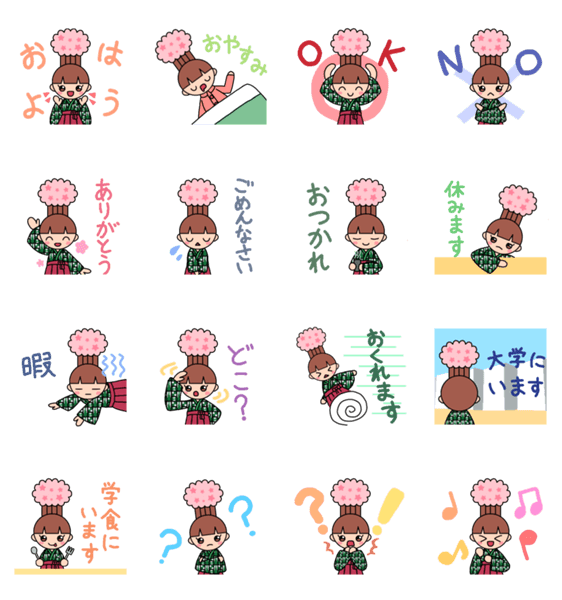 卒業研究で制作した岐阜市立女子短期大学非公式キャラクターのももりんのスタンプです。大学生が日常で使いやすいラインナップになっています。