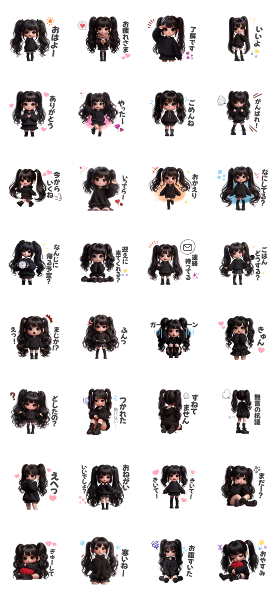 家族や恋人などに使えるスタンプです♡使いやすい/家族/ファミリー/恋人/夫婦/子供/お母さん/連絡/普段使い/日常/ギャル/ツインテール/女の子/女の子/黒/