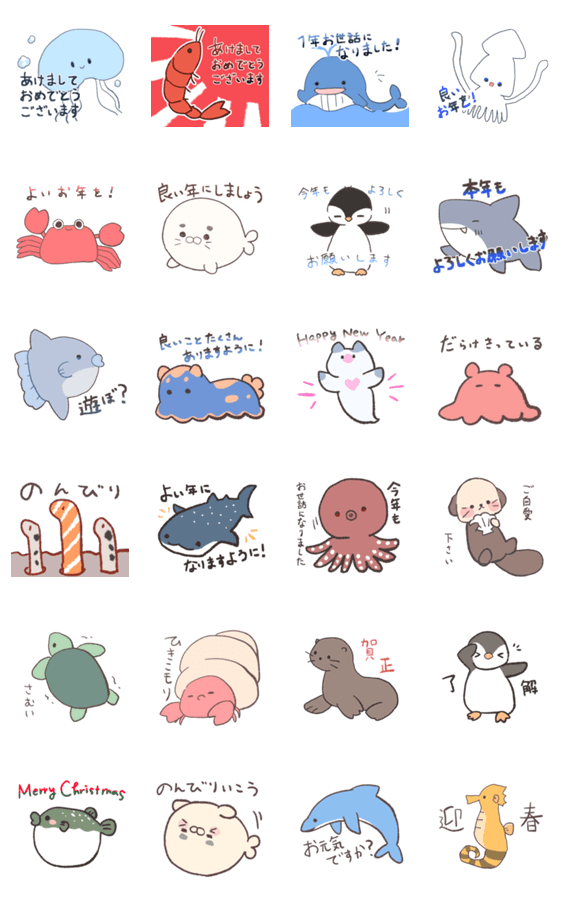 うみのいきものとお正月を過ごすことのできるスタンプです。