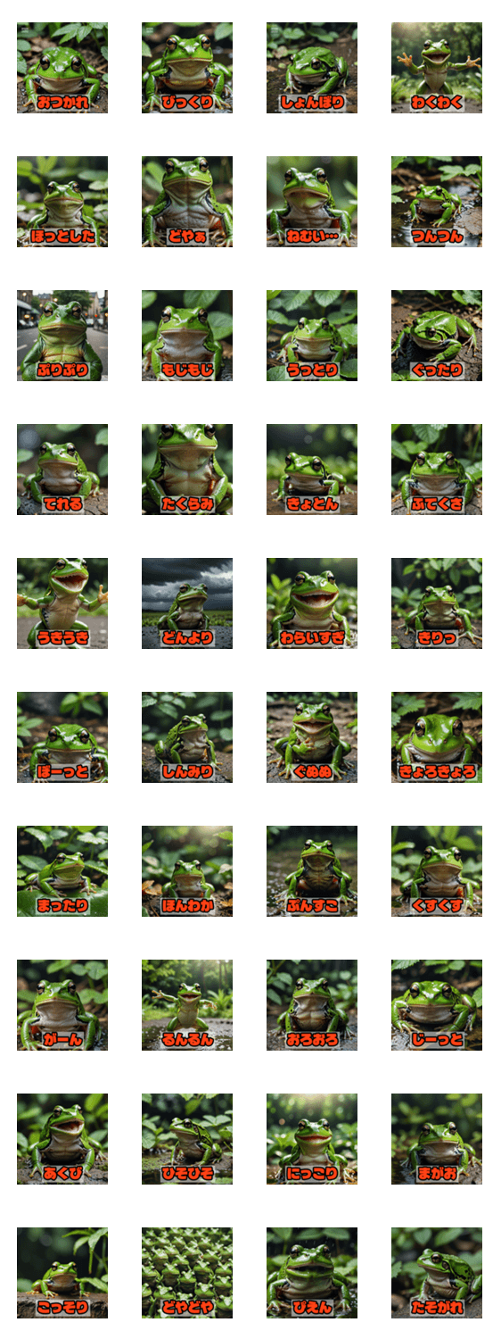 リアルなカエルの写真で作った、実用的なひと言スタンプ集。 どんな場面でも気軽に使える40種類。