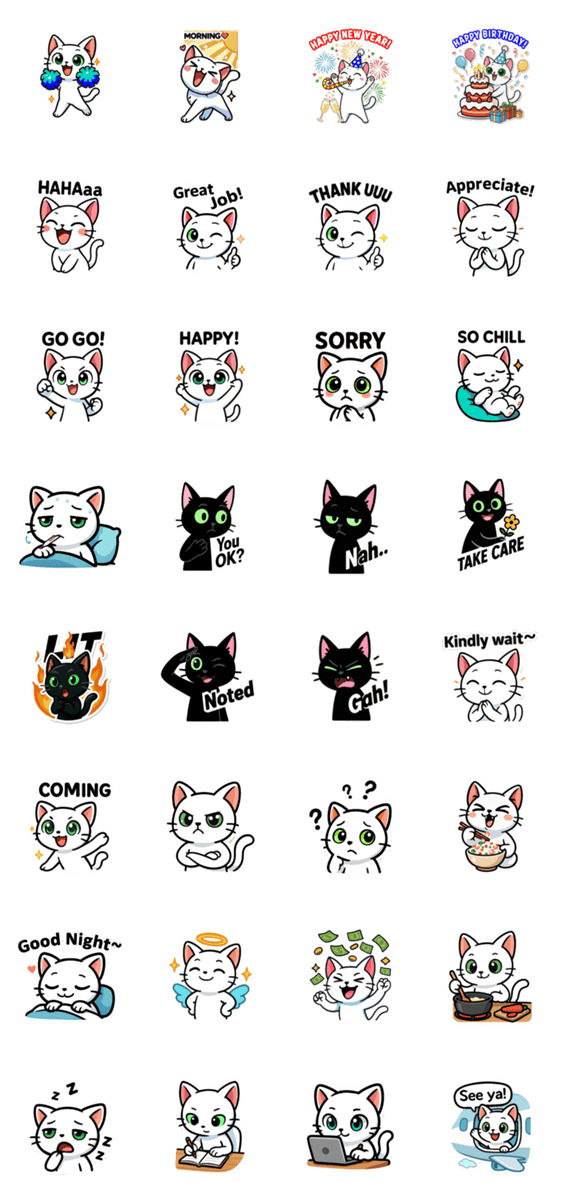 | スタンプ説明 | Mhaan & Heng: a cute white cat and a cool black cat bringing luck, charm, and fun vibes to your chat every day. |