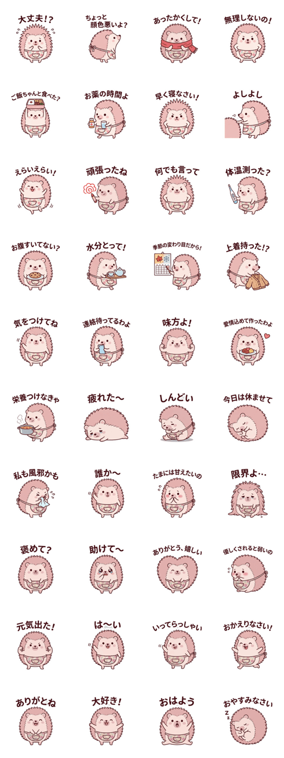 | スタンプ説明 | ハリネズミ/看病/癒し/かわいい/体調不良/風邪/お大事に/気遣い/励まし/挨拶/日常/季節/料理/あったかい/連絡/応援/元気づけ/毎日使える/すんごい使える/ずっと使える |