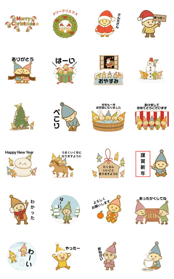 冬のイベントに大活躍! クリスマス、お正月はもちろん、家族・友達との日常の挨拶にも使える!優しい『こびとん』が冬のトークを和ませます。