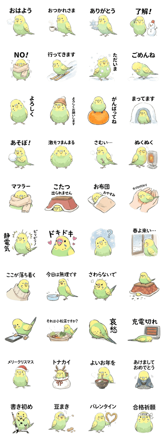 | スタンプ説明 | 緑のセキセイインコの冬用スタンプです。クリスマス、お正月、節分、バレンタインなどの冬行事を網羅。こたつやマフラーでぬくぬく!寒い日のトークを温めます。 |
