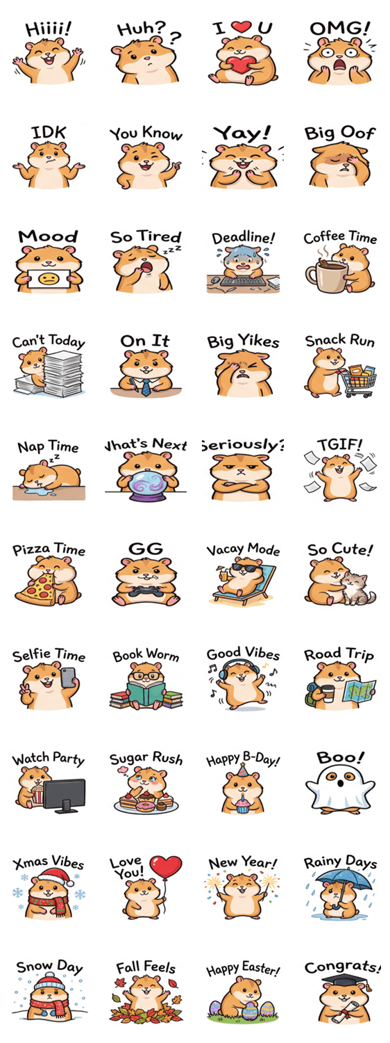 | スタンプ説明 | 手書きの可愛いハムスターがチャットや仕事で大活躍!頬袋いっぱいの元気で気分を表現。平日も週末も楽しく使えます。 |