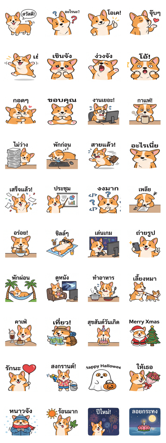 | スタンプ説明 | 手描きの可愛いタイのコーギースタンプ!毎日の気分や仕事の悩みを、ふわふわのお尻と短い足、そして溢れるエネルギーで表現しよう。 |
