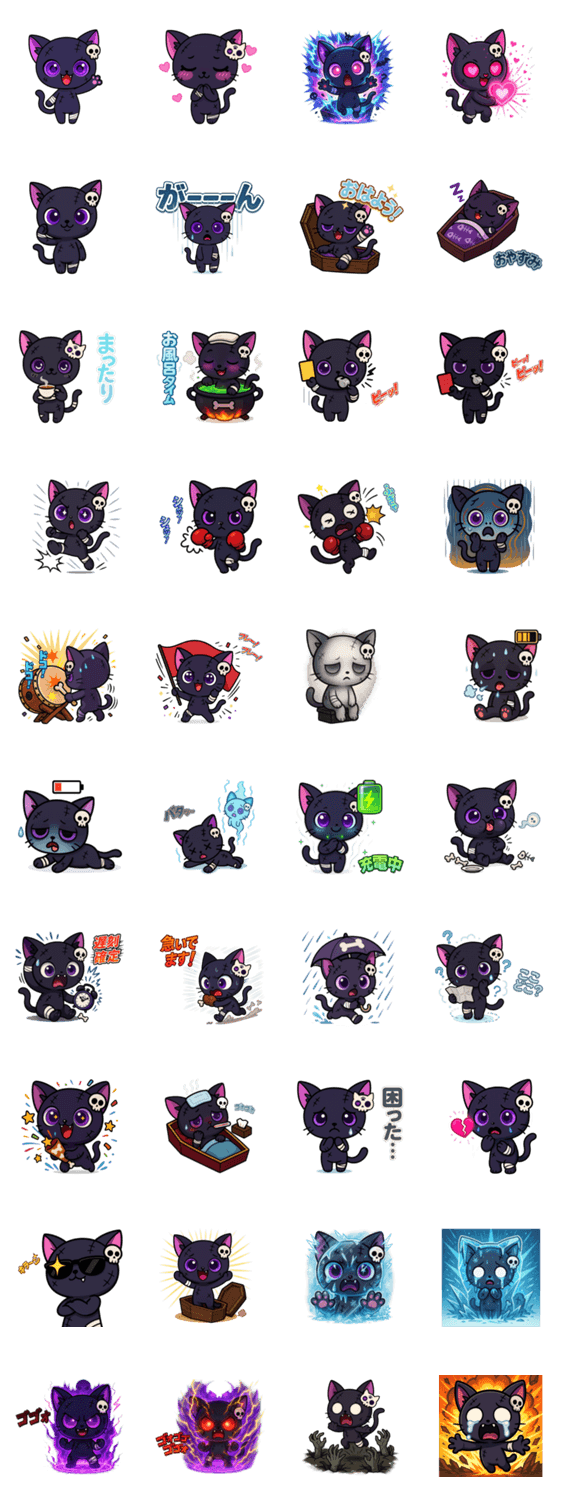 「にゃんデッド」は、猫×アンデッドがテーマのホラーかわいい猫スタンプ。耳のドクロアクセがトレードマークでおしゃれコーデアイテム!