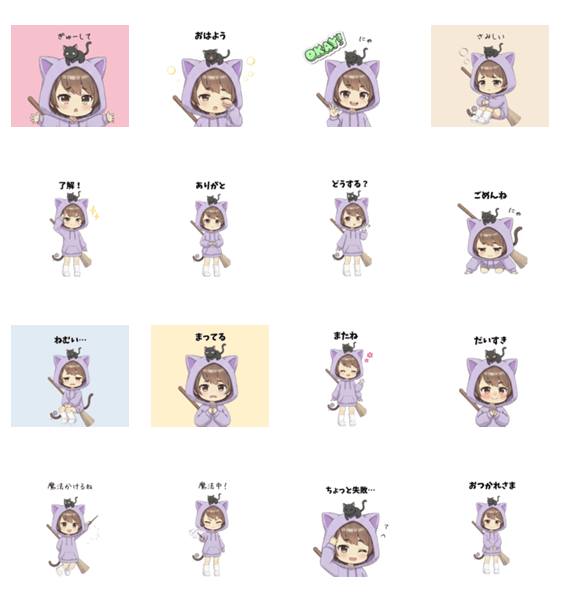 魔法ねこ☆彡まめっぽ第2弾。日常あいさつやOK、お疲れ様など会話に便利!だいすき、ぎゅーしてなど可愛い女の子ねこの、感情表現スタンプです。